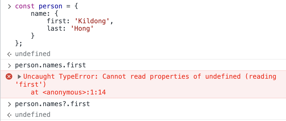 하지만 가장 마지막 줄처럼 optional chaining(?.)을 사용한다면 에러를 발생시키지 않고 에러 대신 undefined를 내보내게 된다.